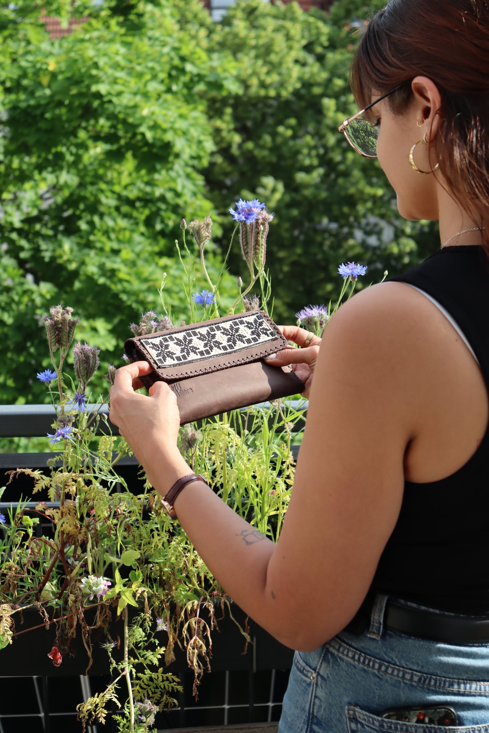 A long Tri-fold wallet, meticulously hand-stitched from rich chestnut brown leather and gracefully adorned with Palestinian tatreez inspired by the Orange Blossom motif — a timeless emblem of Palestinian spring and hope.
